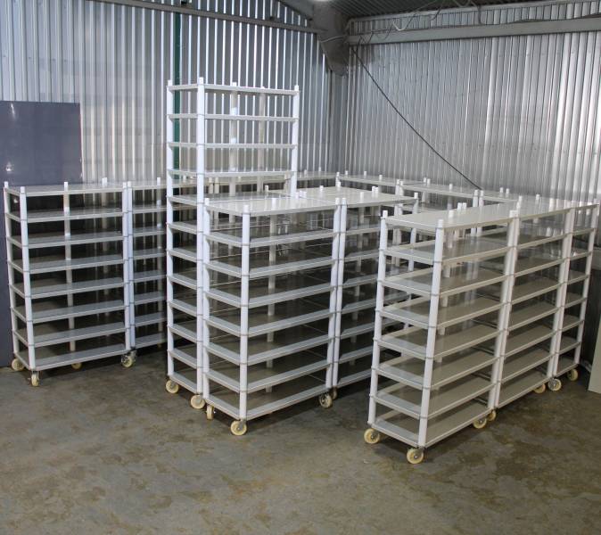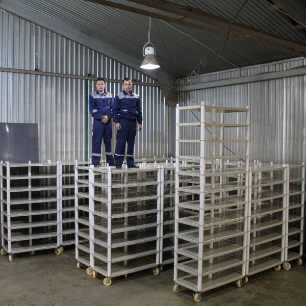 Стеллаж из полипропилена на колёсах, предназначен для хранения продуктов питания, не впитывает и не выделяет запахи, не меняет физико-химические и органолептические свойства продуктов и веществ.